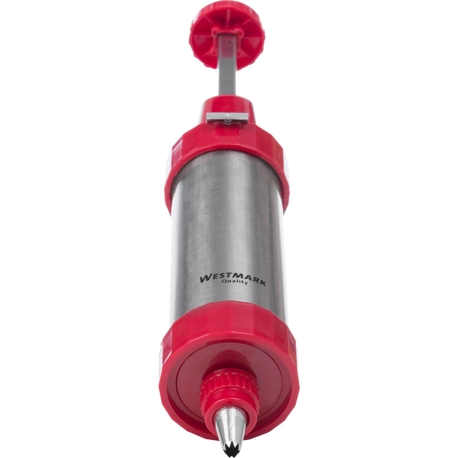 Die WESTMARK Garnierspritze in den ansprechenden Farben silber und rot ist ein unverzichtbares Küchenwerkzeug für alle, die gerne kreativ mit ihren Gerichten umgehen. Mit einem großzügigen Fassungsvermögen von 250,0 ml ermöglicht sie dir, deine Speisen mit einer Vielzahl von Saucen, Dressings oder Dekorationen zu verfeinern. Egal, ob beim Anrichten von Desserts oder beim Garnieren von herzhaften Speisen, diese Garnierspritze bietet dir die Flexibilität, die du benötigst, um deine kulinarischen Kreationen in Szene zu setzen. Hergestellt aus hochwertigem Kunststoff und Edelstahl, vereint die Garnierspritze nicht nur ansprechendes Design, sondern auch Langlebigkeit und Benutzerfreundlichkeit. Die Kombination dieser Materialien sorgt dafür, dass die Garnierspritze leicht zu reinigen ist und auch bei häufigem Gebrauch ihre Funktionalität behält. Mit einer Höhe von 21,7 cm liegt sie gut in der Hand und ermöglicht präzise Anwendungen, die deine Kochkünste unterstreichen. Die WESTMARK Garnierspritze ist ideal für Hobbyköche und Profis gleichermaßen. Sie eröffnet dir neue Möglichkeiten beim Anrichten und sorgt dafür, dass deine Speisen nicht nur gut schmecken, sondern auch optisch beeindrucken. Die durchdachte Konstruktion ermöglicht eine einfache Handhabung, sodass du auch ohne viel Erfahrung im Garnieren beeindruckende Ergebnisse erzielen kannst. Ob du ein festliches Menü vorbereitest oder einfach nur deine alltäglichen Gerichte aufpeppen möchtest, die WESTMARK Garnierspritze ist die perfekte Wahl, um deinen kreativen Ideen freien Lauf zu lassen. Entdecke die Freude am Kochen und Anrichten mit diesem praktischen Küchenhelfer, der dir hilft, deine Gerichte in wahre Kunstwerke zu verwandeln.