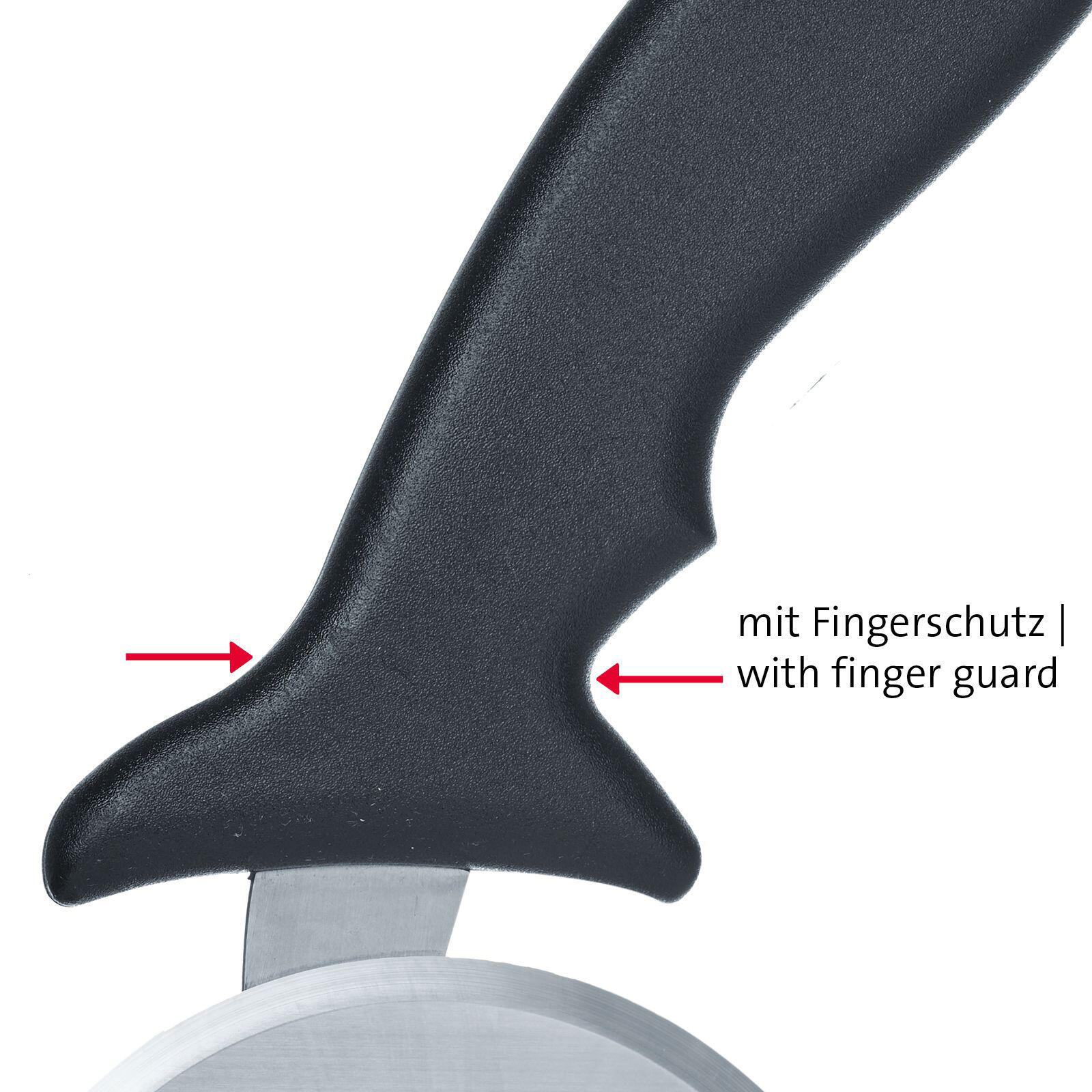 Der ergonomisch geformte Kunststoffgriff sorgt für sicheren Halt und angenehmen Komfort während des Gebrauchs. Ein integrierter Fingerschutz erhöht die Sicherheit und schützt vor Verletzungen beim Schneiden. Zudem ist der Pizzaschneider spülmaschinengeeignet, was die Reinigung besonders einfach und zeitsparend macht.