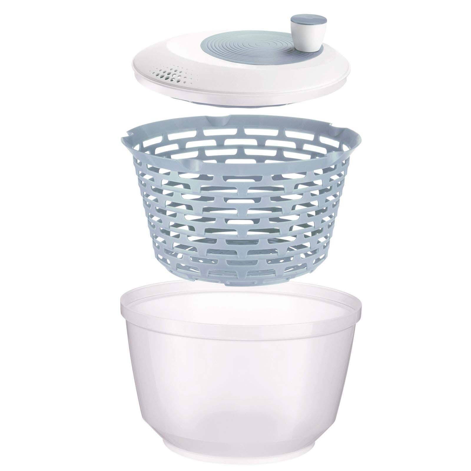 Die WESTMARK Spinderella Salatschleuder in einem sanften pastellblau ist das ideale Küchenutensil für alle, die frische Salate lieben. Mit einem großzügigen Fassungsvermögen von 4,4 Litern bietet sie ausreichend Platz, um auch größere Mengen Salat mühelos zu trocknen. Dank ihrer rutschfesten Unterlage bleibt die Salatschleuder während des Gebrauchs stabil und sicher auf der Arbeitsfläche stehen, was die Handhabung besonders angenehm macht. Die Spinderella Salatschleuder überzeugt nicht nur durch ihre Funktionalität, sondern auch durch das ansprechende Design. Das pastellblaue Farbton bringt frische Akzente in deine Küche und sorgt dafür, dass sie auch als dekoratives Element auf dem Tisch oder in der Küche glänzen kann. Hergestellt aus hochwertigem Polypropylen, ist das Material robust und langlebig, sodass du lange Freude an diesem Küchenhelfer haben wirst. Ein weiteres praktisches Merkmal ist die integrierte Schüttöffnung, die das Abgießen von Wasser nach dem Waschen des Salats erleichtert. So kannst du die Salatschleuder nicht nur für das Trocknen, sondern auch für die Zubereitung von frischen Salaten verwenden. Sie ist zudem spülmaschinengeeignet, was die Reinigung nach dem Gebrauch zum Kinderspiel macht. Mit der WESTMARK Spinderella Salatschleuder erhältst du ein vielseitiges und stilvolles Küchengerät, das dir dabei hilft, gesunde und köstliche Salate in kürzester Zeit zuzubereiten. Egal ob für den Alltag oder besondere Anlässe, dieses Produkt wird schnell zu einem unverzichtbaren Bestandteil deiner Küchenausstattung.Technische Daten