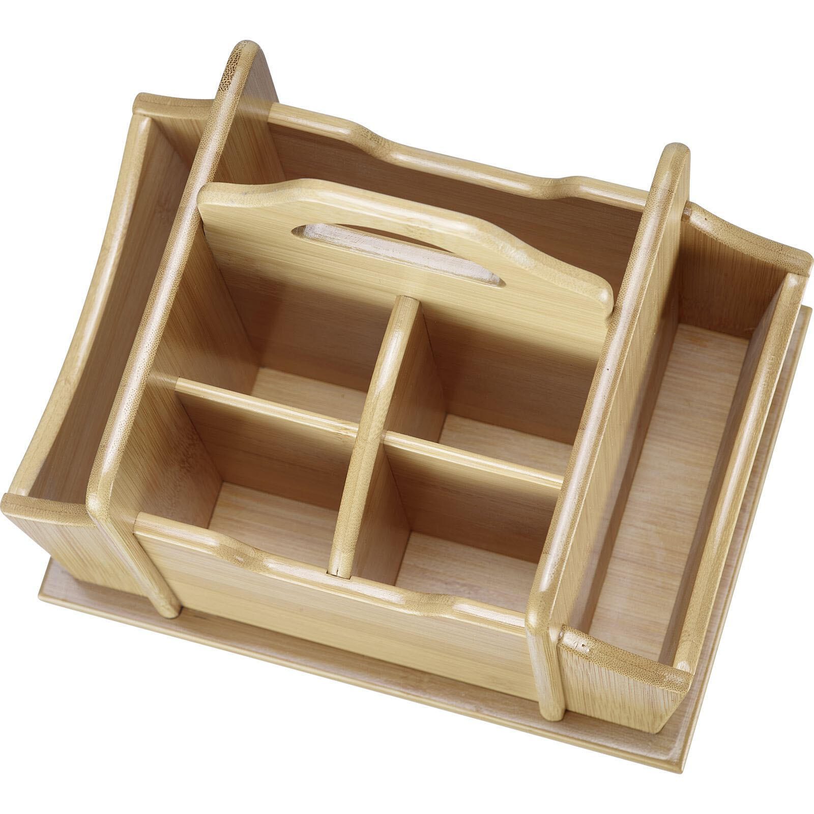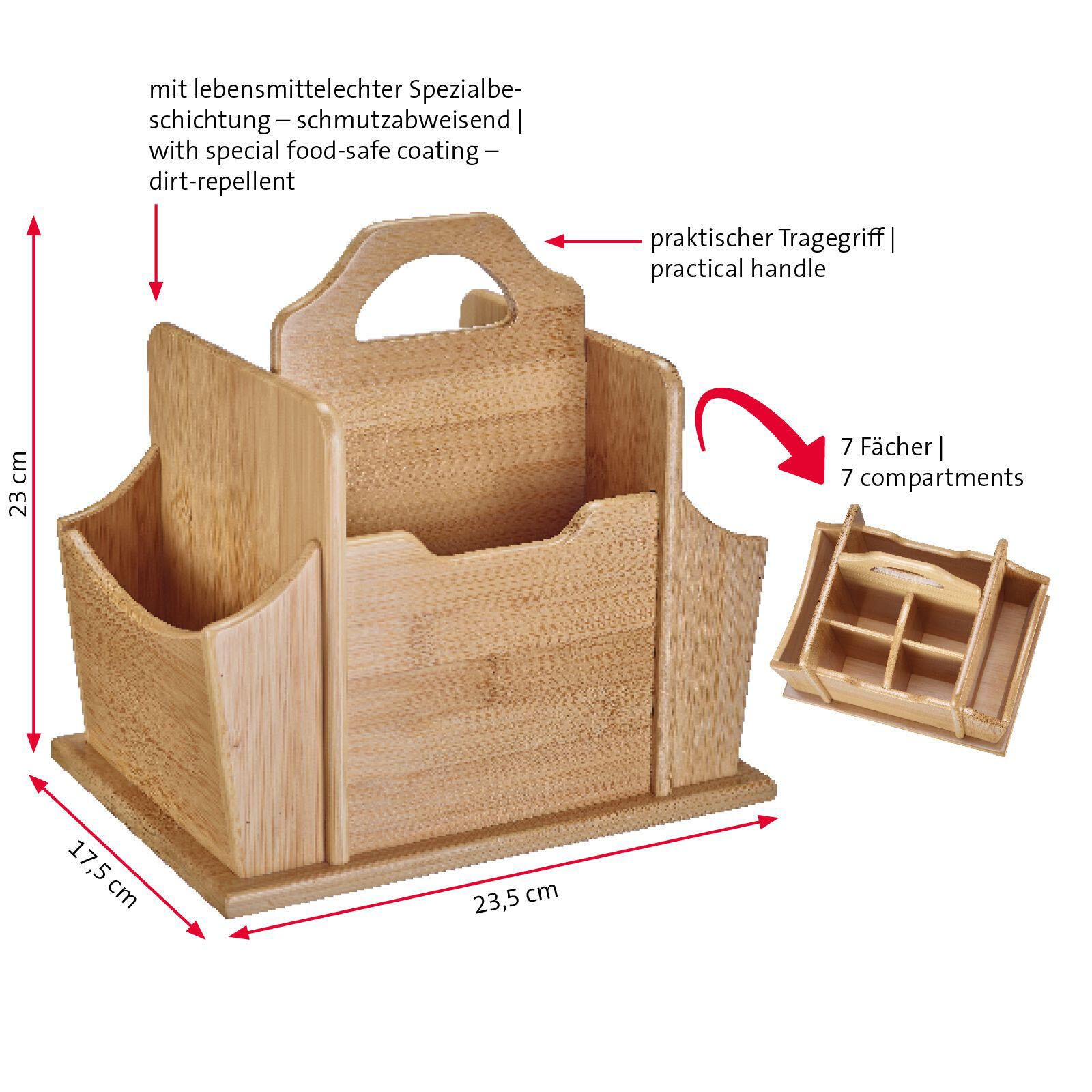 Der WESTMARK Tapas + Friends Besteckhalter in elegantem Braun ist die perfekte Ergänzung für jeden Esstisch, der ein stilvolles und organisiertes Ambiente schaffen möchte. Mit seinem durchdachten Design bietet dieser Besteckhalter insgesamt 7 Fächer, die ausreichend Platz für Besteck, Servietten und andere Tischaccessoires bieten. So sorgst du dafür, dass alles griffbereit ist und dein Tisch immer ordentlich aussieht. Hergestellt aus hochwertigem Bambus, vereint dieser Besteckhalter nicht nur Funktionalität, sondern auch Nachhaltigkeit. Bambus ist ein umweltfreundliches Material, das für seine Langlebigkeit und Stabilität bekannt ist. Die natürliche Farbgebung in Braun verleiht deinem Tisch eine warme und einladende Atmosphäre, die perfekt zu jedem Anlass passt, sei es ein entspanntes Abendessen mit Freunden oder ein festliches Familienessen. Die Serie Tapas + Friends von WESTMARK steht für Qualität und durchdachtes Design. Der Tischbutler aus Bambus ist nicht nur praktisch, sondern auch ein echter Blickfang. Seine schlichte Eleganz macht ihn zu einem vielseitigen Accessoire, das sich harmonisch in jede Tischdekoration einfügt. Die 7 Fächer ermöglichen eine individuelle Anordnung des Bestecks und sorgen dafür, dass du immer den Überblick behältst. Mit dem WESTMARK Tapas + Friends Besteckhalter entscheidest du dich für ein Produkt, das sowohl ästhetisch als auch funktional überzeugt. Ideal für alle, die Wert auf Ordnung und Stil legen. Verleihe deinem Tisch mit diesem praktischen Besteckhalter einen Hauch von Eleganz und genieße die Vorteile eines aufgeräumten Essbereichs.Technische Daten
