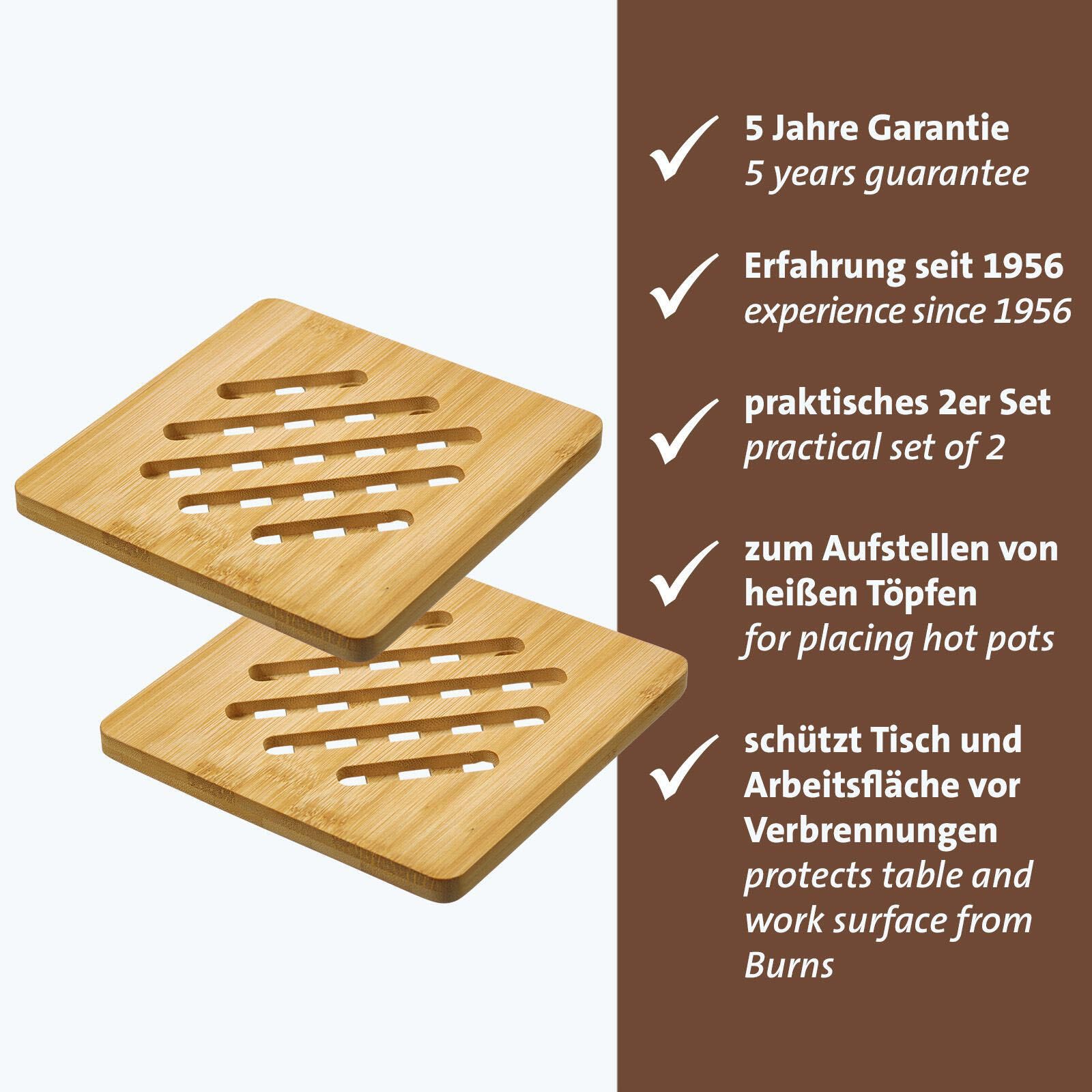 Die WESTMARK Tapas + Friends Untersetzer in einem ansprechenden hellbraunen Farbton sind die perfekte Ergänzung für deine Tischdekoration. Hergestellt aus hochwertigem Bambus, bieten diese Untersetzer nicht nur eine stilvolle Optik, sondern auch eine ausgezeichnete Funktionalität. Bambus ist bekannt für seine Robustheit und Langlebigkeit, wodurch diese Untersetzer sowohl für den täglichen Gebrauch als auch für besondere Anlässe geeignet sind. In einem praktischen Set von 2 Stück kommen die Untersetzer zu dir, sodass du sie problemlos für verschiedene Getränke oder Snacks verwenden kannst. Die quadratische Form der WESTMARK Untersetzer fügt sich harmonisch in jede Tischgestaltung ein und schützt deine Oberflächen vor unschönen Flecken und Kratzern. Die Serie "Tapas + Friends" steht für geselliges Beisammensein und kulinarische Entdeckungen, und diese Untersetzer tragen dazu bei, eine einladende Atmosphäre zu schaffen. Ihre hellbraune Farbe verleiht deinem Tisch eine warme Note und lässt sich mühelos mit verschiedenen Geschirr- und Dekorationsstilen kombinieren. Ob für ein gemütliches Abendessen mit Freunden oder eine entspannte Kaffeepause, die WESTMARK Tapas + Friends Untersetzer sind nicht nur praktisch, sondern auch ein echter Hingucker. Genieße deine Speisen und Getränke in vollen Zügen, während du gleichzeitig dafür sorgst, dass deine Möbel geschützt bleiben. Mit diesen stilvollen Untersetzern bringst du Funktionalität und Ästhetik in Einklang.Technische Daten