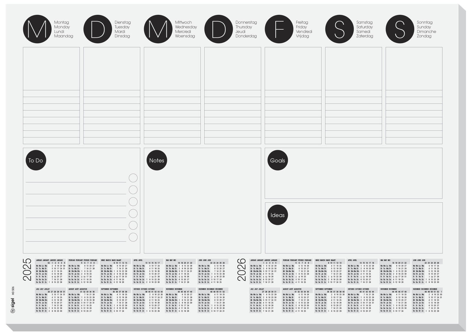 Die SIGEL Schreibtischunterlage in der praktischen Größe von 42,0 x 29,7 cm ist die perfekte Ergänzung für deinen Arbeitsplatz. Mit ihrem eleganten schwarz/weißen Design und dem klaren Kalender-Motiv bringt sie nicht nur Ordnung auf deinen Schreibtisch, sondern sorgt auch für einen stilvollen Akzent. Die Unterlage ist aus hochwertigem Papier mit einem Gewicht von 80 g/m² gefertigt, was für eine angenehme Haptik und Langlebigkeit sorgt. Mit insgesamt 30 Seiten bietet dir dieser Wochenplaner ausreichend Platz, um deine Termine und Aufgaben übersichtlich zu organisieren. Die durchdachte Gestaltung ermöglicht es dir, den Überblick über deine Woche zu behalten und Prioritäten effizient zu setzen. Die Unterseite aus robustem Karton sorgt dafür, dass die Schreibtischunterlage stabil auf deinem Tisch liegt und nicht verrutscht, selbst wenn du intensiv daran arbeitest. Die Kombination aus Funktionalität und ansprechendem Design macht die SIGEL Schreibtischunterlage zu einem unverzichtbaren Hilfsmittel für alle, die Wert auf eine strukturierte Arbeitsweise legen. Egal, ob im Home Office oder im Büro, sie unterstützt dich dabei, deine Ziele zu erreichen und deine Kreativität zu entfalten. Die schlichte Farbgebung in schwarz/weiß fügt sich harmonisch in jede Büroumgebung ein und lässt sich leicht mit anderen Büromaterialien kombinieren. Entdecke die Vorteile der SIGEL Schreibtischunterlage und erlebe, wie sie deinen Arbeitsalltag erleichtert.Technische Daten