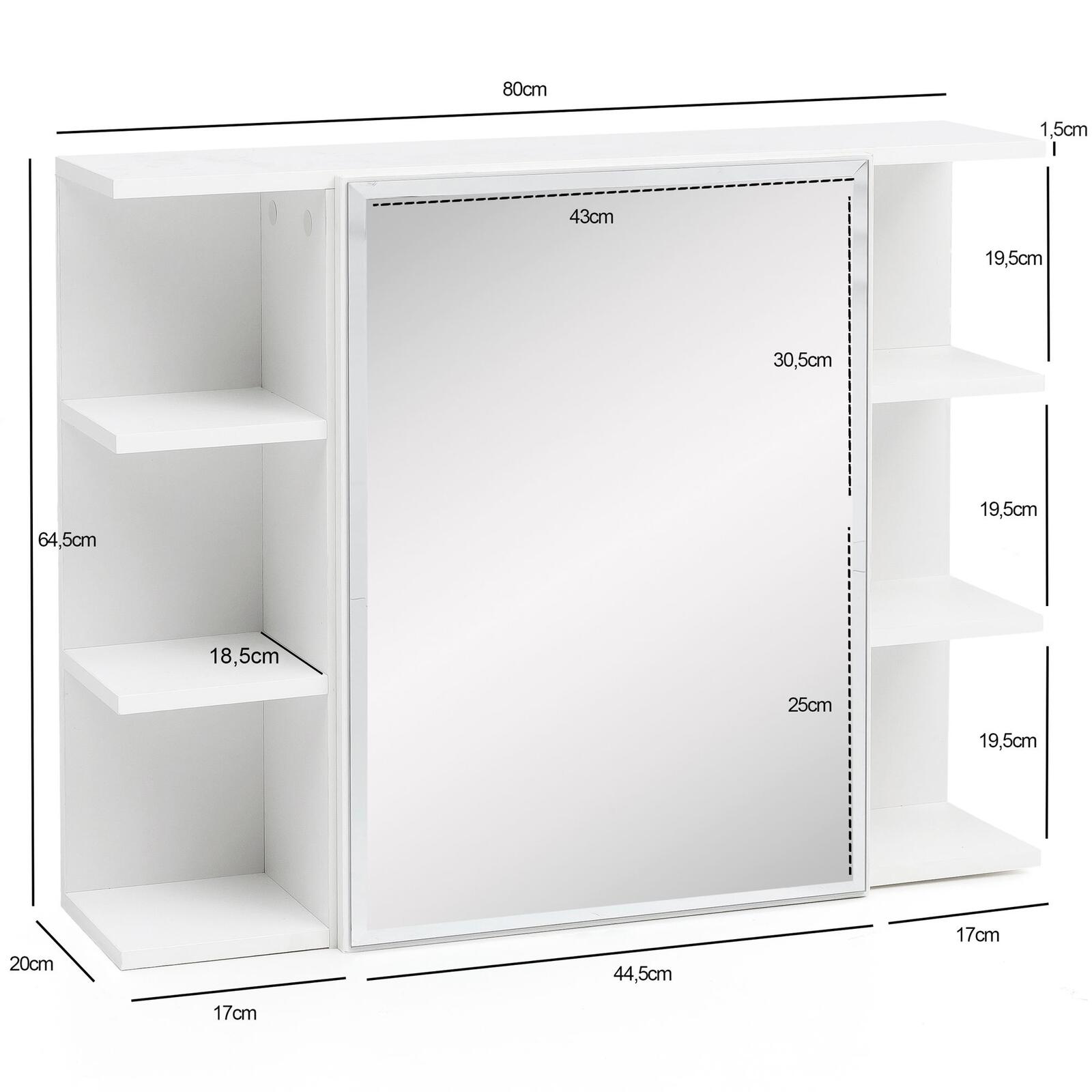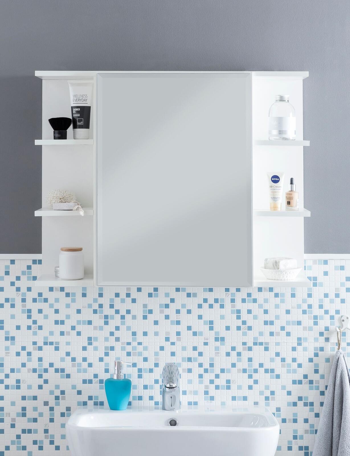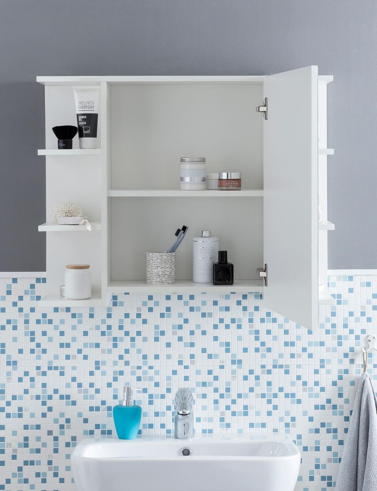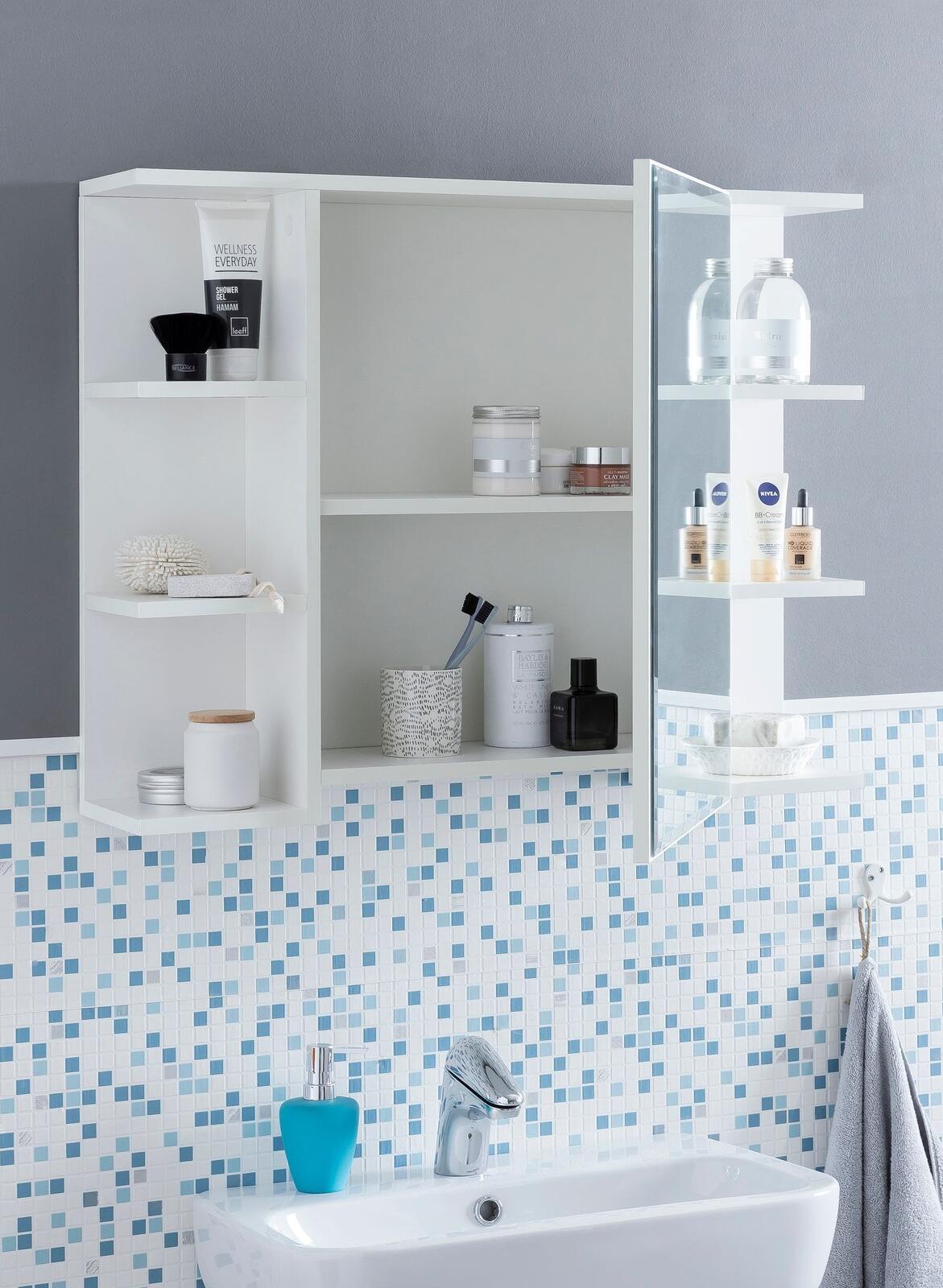 • Sechs offene Fächer und zwei praktische Türfächer hinter dem Spiegel