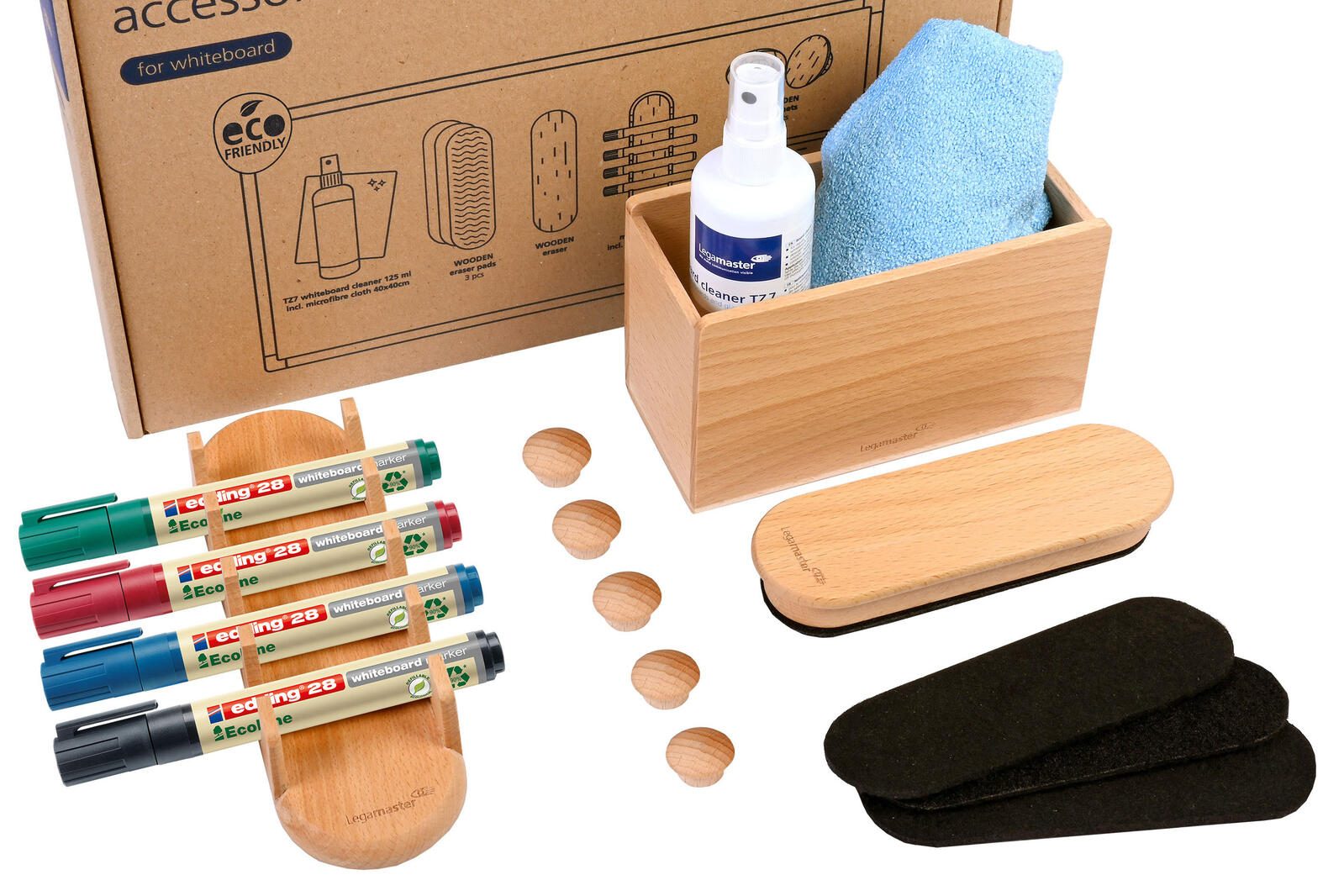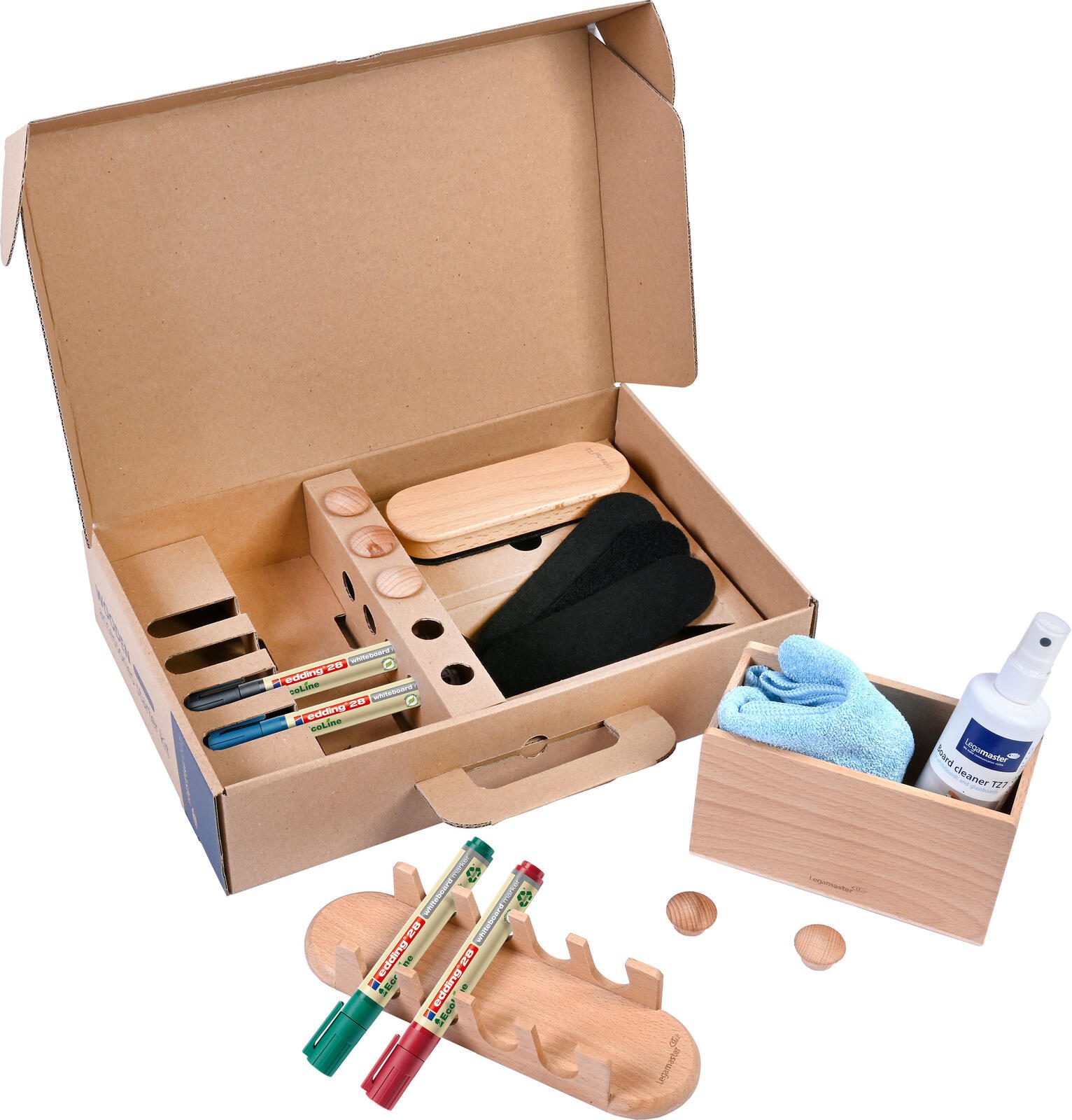 Im Lieferumfang enthalten sind ein Whiteboardlöscher, drei Pads für Tafellöscher, ein Zubehörhalter, ein Markerhalter, fünf Magnete, vier edding 28 EcoLine Whiteboardmarker in den Farben Schwarz, Rot, Blau und Grün, ein TZ7 Whiteboard Reiniger (125 ml) sowie ein Mikrofasertuch (40x40 cm). Mit diesem umfangreichen Zubehör bist du bestens ausgerüstet.