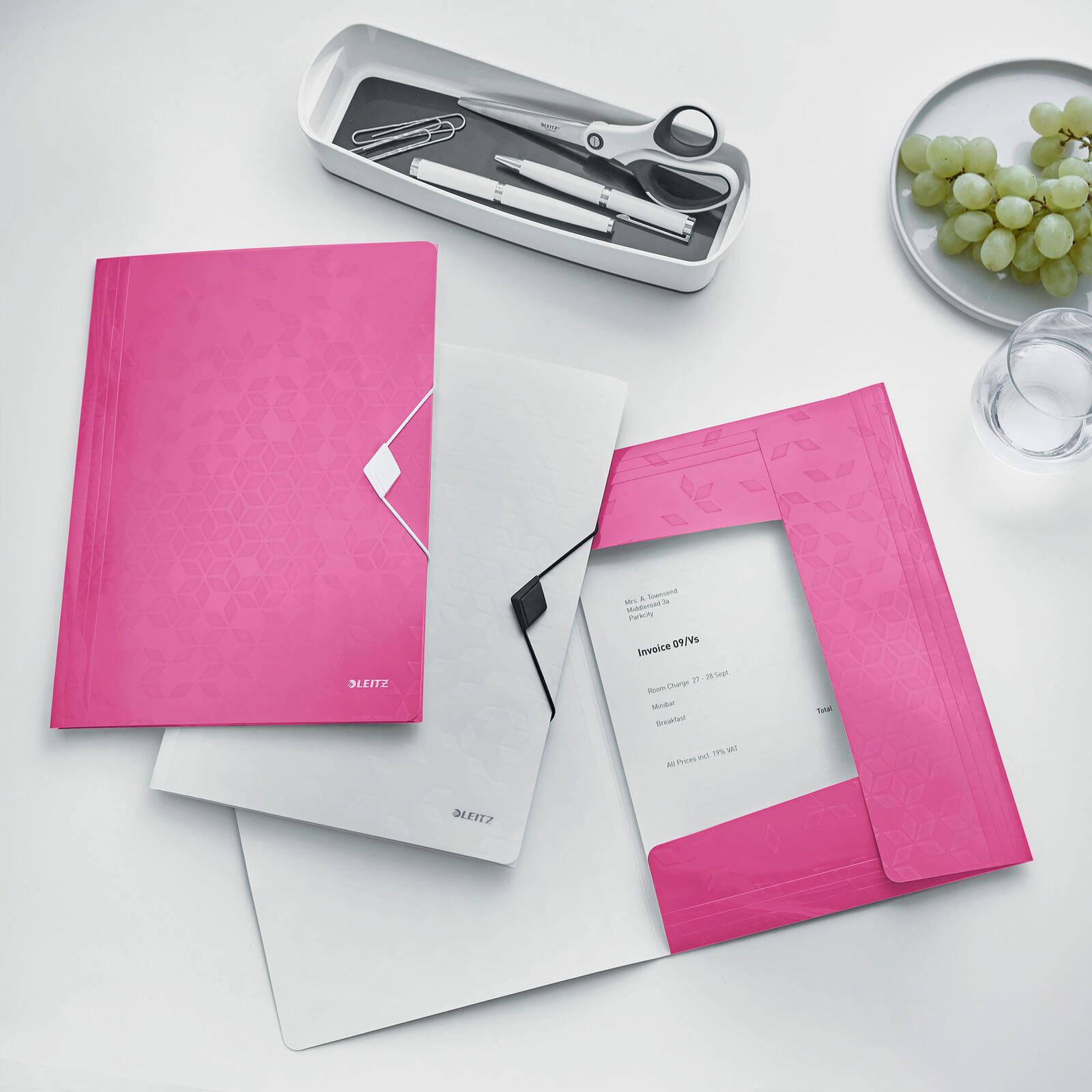 Die LEITZ Eckspannmappen in lebhaftem Pink aus der WOW-Serie überzeugen nicht nur mit ihrer auffälligen Farbe, sondern auch mit ihrer Funktionalität. Hergestellt aus strapazierfähigem Polypropylen (PP) sind sie ideal zum Aufbewahren und Präsentieren von Dokumenten im DIN A4-Format.