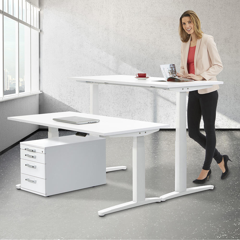 Der HAMMERBACHER elektrisch höhenverstellbare Schreibtisch VXBHM16/W/WW in elegantem Weiß vereint Funktionalität und modernes Design auf harmonische Weise. Mit einer großzügigen Tischplatte aus robuster Spanplatte und einem stabilen Stahlgestell bietet dieser Schreibtisch nicht nur eine ansprechende Optik, sondern auch eine hohe Langlebigkeit. Die Maße von 160 cm in der Breite, 80 cm in der Tiefe und einer Höhe von 65 cm machen ihn zu einer idealen Wahl für verschiedene Arbeitsumgebungen, sei es im Home Office oder im Büro. Ein herausragendes Merkmal dieses Schreibtisches ist die elektrische Höhenverstellbarkeit, die es Ihnen ermöglicht, die Tischhöhe individuell anzupassen. Dies fördert nicht nur eine ergonomische Haltung, sondern trägt auch zu einem gesünderen Arbeitsumfeld bei, indem Sie zwischen Sitzen und Stehen wechseln können. Die C-Fuß-Gestell-Ausführung sorgt zudem für eine optimale Beinfreiheit und Bewegungsfreiheit während der Arbeit. Die schlichte, weiße Farbgebung des Schreibtisches lässt sich mühelos in jede Büroeinrichtung integrieren und verleiht Ihrem Arbeitsbereich eine freundliche und helle Atmosphäre. Ohne zusätzliche Fächer oder Schübe bleibt der Schreibtisch klar und übersichtlich, sodass Sie Ihre Arbeitsmaterialien stets im Blick haben. Die Montage des Schreibtisches ist dank der durchdachten Konstruktion unkompliziert und schnell erledigt. Der Memoryschalter, der links oder rechts montierbar ist, ermöglicht eine bequeme Anpassung der Höhe auf Knopfdruck. Insgesamt bietet der HAMMERBACHER elektrisch höhenverstellbare Schreibtisch VXBHM16/W/WW eine ausgezeichnete Kombination aus Stil, Funktionalität und Ergonomie, die Ihre Produktivität steigern und gleichzeitig für ein angenehmes Arbeitsumfeld sorgen kann.Technische Daten