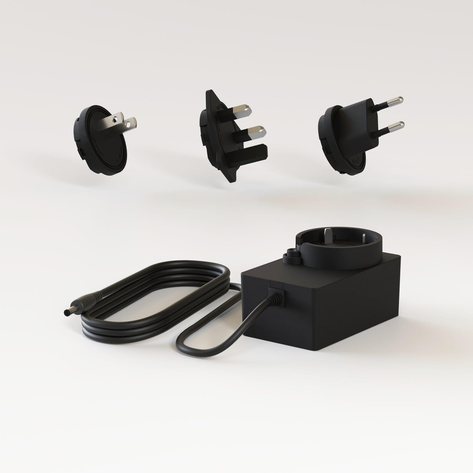 - Adapterstecker: Typ A (USA), Typ C (EU) und Typ G (UK)