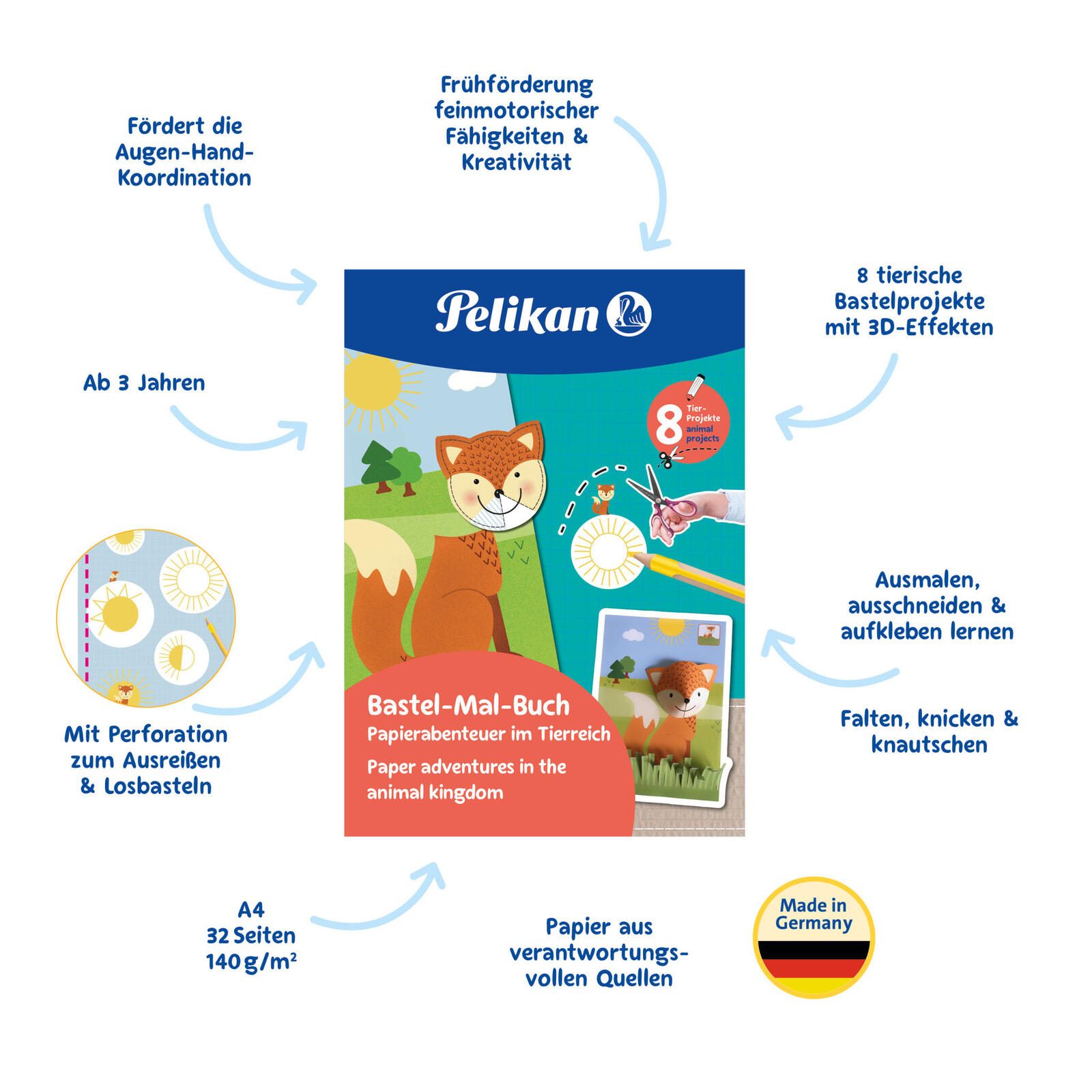 - Besonderheiten: Das Pelikan Bastel-Mal-Buch "Tierreich" mit 8 Bastelprojekten ist ideal für 3-4 Jährige Kinder, es fördert die Auge-Hand-Koordination.