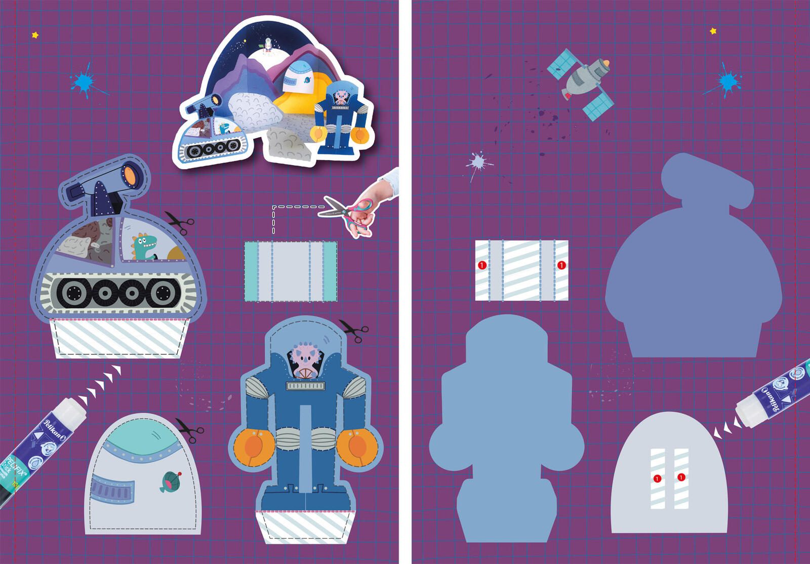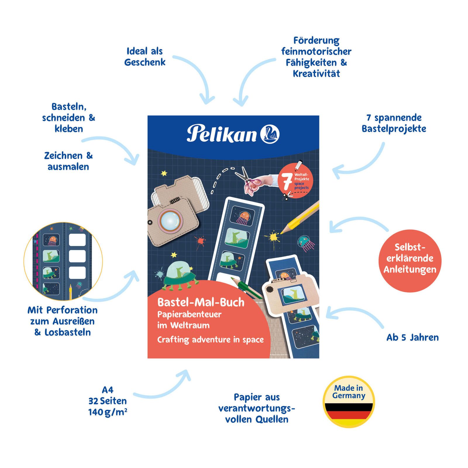 - Besonderheiten: Das Pelikan Bastel-Mal-Buch "Weltraum" mit 8 Bastelprojekten ist ideal für 3-4 Jährige Kinder, es fördert die Auge-Hand-Koordination.